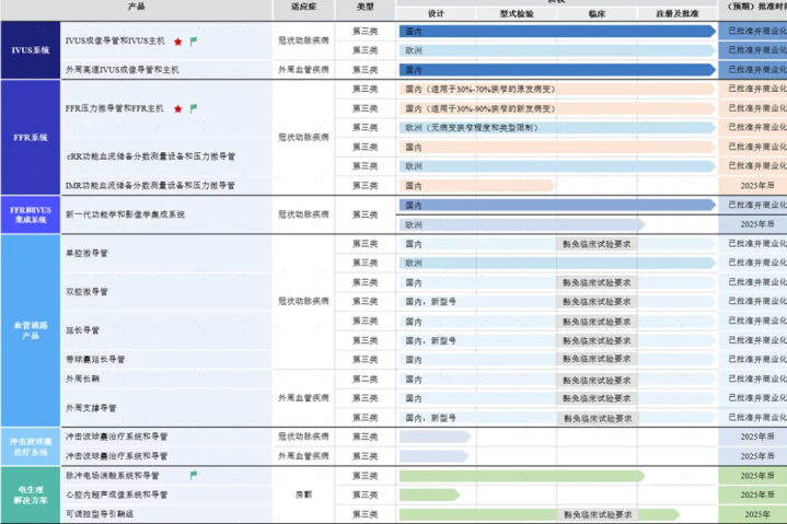 依据招股书信息,北芯生命目前已成功将11款产品推向市场,同时还有6款在研产品,涵盖血管内超声(IVUS)系统、血流储备分数(FFR)系统、血管通路产品、冲击波球囊治疗系统以及电生理解决方案等五大产品类别。其中,公司的核心产品IVUS系统是中国首个自主研发的60MHz高清高速国产IVUS产品,具备高清成像、高速数据传输以及智能化操作三大显著特点,能够高效便捷地为精准PCI(经皮冠状动脉介入治疗)策略制定提供有力指导。该产品还入选了国家科技部国家重点研发计划数字诊疗装备研发重点专项“高分辨、高速、智能化心脏介入血管内超声成像系统”。另一核心产品FFR系统作为PCI治疗指导及诊断心肌缺血的权威标准,获得了国内外多项指南及专家共识的高度推荐。国家药监局官网评价其“处于国际领先水平,国内首创”,并指出其“填补了我国在金标准血流储备分数测量技术领域的空白”。