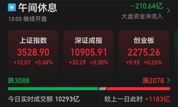 7月18日上午,A股三大指数震荡走高,截至午间收盘,沪指涨0.34%,深证成指涨0.30%,创业板指涨0.26%,北证50指数跌0.48%。沪深北三市半日成交额为10293亿元,较上个交易日同期放量1183亿元。全市场超3000只个股下跌。