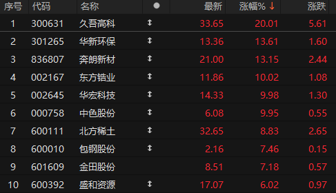 7月18日上午,稀土板块全线走高,久吾高科“20cm”涨停,东方锆业、华宏科技等涨停封板,北方稀土盘中触及涨停,股价创3年新高。